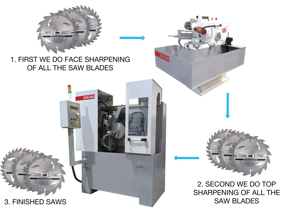 Generally, what sharpening shops do is sharp the face of all the saw blades they have, then set up the machine to sharp the top of the tooth, and grind all the tops of the saw blades.