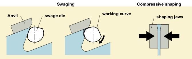 To perform the swaging process, an swaging die is placed in front of the saw tooth, which is held steady with an anvil. By rotating the eccentric swaging die, the saw material is displaced towards the tooth tip. Once the swaging process is completed, the swaging die rotates back into its starting position.
